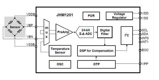 The JHM1203 is a high accuracy signal conditioning IC designed for differential resistive bridge sensor signals for high resolution altimeter module applications. A low-noise instrumentation amplifier with gain and offset tuning capability amplifies the input bridge signal to a level which fits the input range of a 24-bit delta-sigma A/D converter. The digitized input is compensated up to 2nd order for thermal drifts of offset and gain as well as non-linearity in digital domain. A temperature signal from an on-chip sensor is digitized and fed to the compensation circuit, too. The compensation coefficients can be written to the on-chip programmable non-volatile memory (OTP). The measured and corrected bridge values and temperature values can be read through the I2C interface.