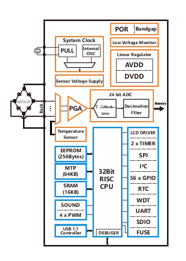 JHM3802 is a SoC chip specially developed for instrumentation applications. It integrates a 32-bit RISC microprocessor and sensor analog front-end signal processing circuit including low-noise pre-amplifier with configurable gain, an 8-channel 24-bit high-resolution sigma-delta ADC, and a built-in high linearity temperature sensor.