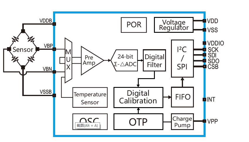 The JHM1400 is a high accuracy signal conditioning IC designed for differential resistive bridge sensor signals. The differential voltage signal output by the bridge sensor can be converted to a digital signal with high accuracy and then digitally compensated by the JHM1400. The final measurement can be read out through an I2C or SPI interface.
